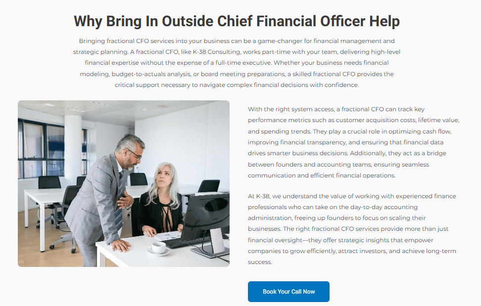 K-38 Consulting, LLC specializes in delivering professional fractional CFO services that help businesses enhance financial clarity, optimize operations, and achieve long-term growth. Their team works closely with clients to understand unique challenges and design customized strategies that deliver measurable results.